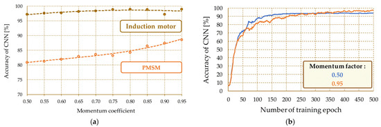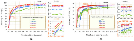 The increased number of network layers results in an increase in the number of neural connections, which, in turn, translates into an extended training process. However, as can be seen in Figure 5, the ultimate precision of the lattice increases to a certain level with each successive convolutional layer. Additionally, faster stabilization of the training process is noticeable, both in the case of the IM winding damage diagnostic system (Figure 5a) and PMSM (Figure 5b).