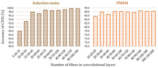 The analysis of the precision of the network response to the testing data, presented in Table 2 and Figure 6, shows a clear increase in CNN effectiveness while increasing the number of filters in each network layer. The biggest change is observed in the case of the IM damage detection system. The difference in precision between CNN structures with the highest and lowest scoring efficiency is about 12%. Much smaller changes in precision due to the increase in the number of filters are noticeable for the PMSM diagnostic system. In this case, the difference in the determined efficiencies is approximately 3%. To show the influence of the number of convolutional filters on the adaptation process of net weights, Figure 7 presents selected training curves recorded during the CNN training process.