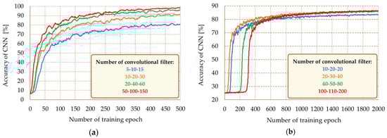 The waveforms of the average network efficiency value for randomly assigned elements of the testing package shown in Figure 5 show that the use of more than four convolutional layers does not significantly affect the precision of the network. This is confirmed by the network efficiency values, calculated on the basis of responses to the testing data, presented in Table 1. It is also worth noting that the analysis of the influence of the convolution layer required the use of additional pooling layers, activation, and normalization functions. However, these layers are not subject to training; therefore, their impact on network performance is considered negligible. The attachment of successive convolutional layers is related to the necessity of extracting symptoms of higher order to facilitate the classification process. On the contrary, the size of the set of considered features is related to the declared number of filters, in particular, CONV. In order to analyze the effect of the number of filters, research was carried out on the CNN network with three CONV layers while increasing the number of filters (Table 2).