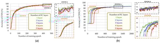 As can be seen in Figure 7, the increase in the number of filters in the CONV layers results in the stabilization of the learning curves with a gradually higher level of precision for the IM and PMSM diagnostic systems. Furthermore, in the case of networks that perform the PMSM stator failure classification task (Figure 7b), a much longer tuning of the training process (initial slight change in the precision level) is noticeable than for the induction motor. This phenomenon results from the incompatibility of the training process parameters with the gradually increasing CNN structures. The assignment of the grid input matrix to one of the known categories on the basis of information about the features from the convolutional sets is possible thanks to the use of fully interconnected layers. Therefore, the next stage of research on the influence of the CNN structure on the precision of the diagnostic system involved changing the number of these layers. The research was carried out on the basis of a network with three convolution sets for both IM and PMSM. The test results are summarized in Table 3.