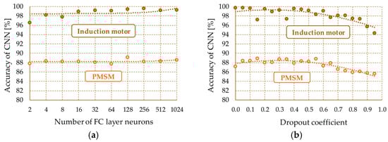 As shown in Table 3, networks with two hidden layers were characterized by the highest level of precision, especially in the case of IM. In the case of PMSM, the differences were not as clear, but the use of two FC layers limits the expansion of the network structure, and increasing the number of these layers does not significantly improve the accuracy of the network response. Therefore, for both considered diagnostic systems, only the effect of the number of neurons in the first fully connected layer was analyzed since the number of neurons in the output layer is predetermined by the number of categories analyzed by the network (Figure 8a). Furthermore, due to the direct connection between the DROP and FC layer, the influence of the declared probability of neuron rejection on the operation of the developed diagnostic systems was checked (Figure 9b).