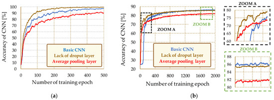 Analysis of the CNN training algorithm—learning curves: (a) accuracy of the CNNs for testing data; (b) loss function.