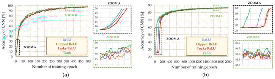 The last stage of the research on the impact of the network structure involved changing the activation function. For this purpose, the operation of the network using the activation functions in the form of a rectified linear function (ReLU), clipped ReLU, leaky ReLU, and the hyperbolic tangent (Tanh) function was analyzed. The course of the CNN network training process with different activation functions is presented in Figure 11.
