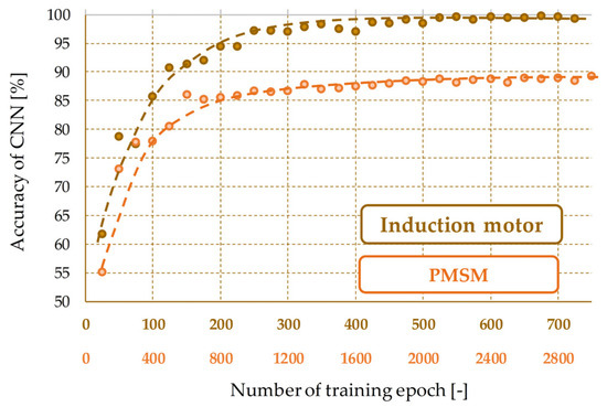 The courses of dependence of the precision of diagnostic systems on the number of training epochs presented in Figure 12 show that after reaching 400 and 1600 epochs, respectively, for CNN-IM (CNN-based diagnostic system for IM) and CNN-PMSM (CNN-based diagnostic system for PMSM), a clear stabilization of the precision level occurs. An excessive increase in the number of learning epochs does not disturb the operation of the network. Moreover, due to the use of the techniques of normalization, rejection, and training based on a randomly created mini-batch of data, the risk of overmatching with the training data is minimized. However, during the practical implementation of CNN, in addition to analyzing the effectiveness of the network for training, validation, and final testing data, it is advisable to observe changes in the course of the loss function in each training epoch. Such an approach will make it possible to interrupt the learning process after achieving the assumed precision or, more importantly, during a sudden increase in the value of the loss function for validation data.