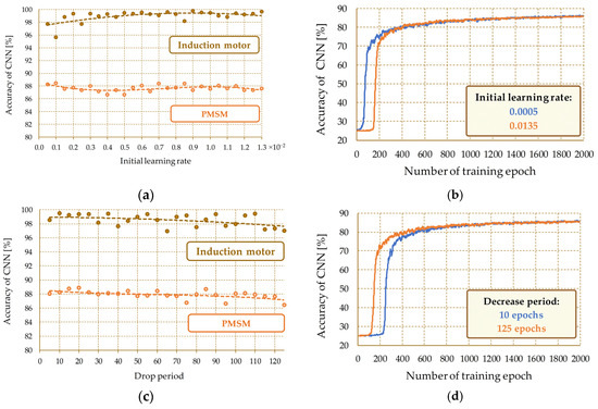 A particularly important parameter of the CNN training process, which ensures the appropriate dynamics of the learning process and its convergence, is the initial value of the learning constant (Figure 13a). Due to the inability to accurately determine the value of this constant, the drop period technique is often used before starting the training process. The study used a 5% decrease in the value of the learning constant for a variable period (Figure 13c). In order to determine the impact of the learning constant and the period of its decrease, both the change in the level of precision of the CNN (Figure 13a,c) and the impact on the course of the training process (Figure 13b,d) were analyzed.