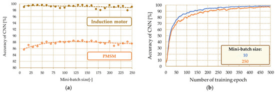 In the experimental studies presented in the following sections of this article, the ITSC detection systems for the IM and PMSM are considered. The CNN structure, the basis of the respective diagnostic systems, was selected with the assumption of the possibility of detection and assessment of the degree and location of ITSCs. Therefore, CNNs adapted to the IM and PMSM stator diagnostics system are characterized by the different numbers of neural connections and, consequently, different features in the context of diagnostic ability. Detailed parameters of the CNN structures constituting the main element of the IM and PMSM diagnostic systems are summarized in Table 1. The optimal structure of CNN meeting the criterion of the stator fault detection efficiency was the reference point in the further study of the influence of the parameters of the training process and the CNN structure.