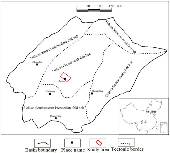 The Sichuan Basin is a typical superimposed basin in southern China [59]. Since the late Indosinian period, the basin has experienced multi-stage strong tectonic movements in the Yanshanian and the Himalayan periods, resulting in the current tectonic pattern of the basin. According to the tectonic deformation intensity, the basin can be divided into five structural belts [60], including the middle strong fold belt in southwest Sichuan, the middle weak fold belt in middle Sichuan, the middle strong fold belt in west Sichuan, the weak fold belt in north Sichuan and the strong fold belt in east Sichuan. The study area is located in the weak fold belt in middle Sichuan (Figure 1), with no large faults, being at a higher position of structure in the paleo-structure, with a beneficial geologic condition for the formation of large gas fields. The gas reservoir of the Upper Triassic Xujiahe formation in the Anyue area of the Sichuan Basin is the largest tight sandstone gas reservoir discovered in the Sichuan Basin in recent years [61].