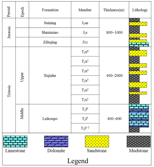 The tight sandstone reservoirs are Xu-2, Xu-4 and Xu-6, members of the Xujiahe formation (Figure 2). The sedimentary Triassic Xujiahe formation consists of shale and sandstone [62]. The sedimentary system is a braided river delta, and the effective reservoirs are mainly distributed in the microfacies of distributaries channels, mouth bars and shore-shallow lacustrine sand bars. The cumulative sandstone thickness is 200–340 m, with an average porosity of 7.24%. The types of reservoir space are inter-granular pore, inter-granular dissolved pore, matrix pore and micro-fracture [63]. The source rocks are dark mudstones of T3X1, T3X3 and T3X5 members, with a total thickness of more than 130 m [64].