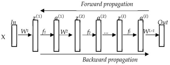 As a type of machine learning, deep learning uses multi-layer nonlinear units to generate a multi-layer representation of data at different levels of abstraction. According to the system structure, it can learn representations and characteristics directly from the input without much prior knowledge, manual coding rules or engineering features [65]. The DFNN used the error backpropagation algorithm [66] to optimize the weight matrix of each layer (Figure 4). By comparing the error between the actual output and the expected output, the error signal was propagated from the output layer to the input layer to obtain the error signal of each layer, and then the weight coefficient of each layer was adjusted to reduce the error, thereby obtaining a new weight. Then, we adjusted the weight continuously to minimize the error to obtain the optimal weight coefficient.