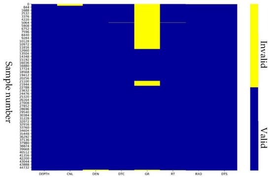 Invalid (null) logging data often appear at the top or bottom of the entire logging curve. Different logging series were measured in several runs, resulting in different depth ranges of null values for each curve. Therefore, before training, it was necessary to delete invalid values (Figure 6). The statistical results after deletion are shown in Table 1.