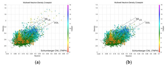 The reason for data correction is to reduce the instability of model training due to the error in data samples. Under the influence of a borehole environment, such as borehole collapse or mud invasion, logging data often fail to reflect the real information about the formation. Especially the RHOB curve, which was measured clinging to the borehole wall with a shallow detection depth, was easily affected by the borehole environment [67,68]. Therefore, these wrong data points need to be corrected. Figure 7 is the ccrossplot before and after correction. It shows that low-RHOB and high-NPHI data points were well corrected.