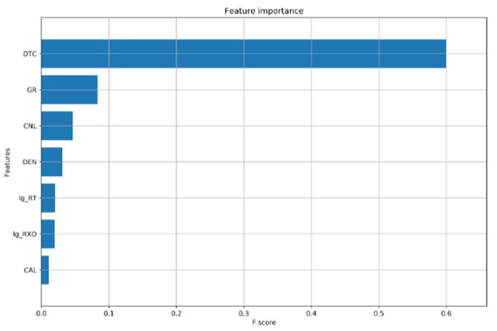 Feature selection is selecting effective features from the original feature curves to reduce the dimension of the data set, a key preprocessing step in machine learning and data mining [69,70]. In the case of high-dimensional data sets, using a feature curve owing to low correlation with the target curve will result in a low-quality model. There are several conventional logging curves; selecting the feature curve possessing a higher correlation with shear sonic curve before model training is necessary. With the XGBoost algorithm [71], the importance was ranked according to its gain value in all boosting decision trees. The importance of predicting the shear velocity increases with the growth of the F score. As shown in Figure 8, the order of importance is DTC < GR < CNL < RHOB < log (RT) < log (RS) < CAL. Therefore, the top five feature curves were selected according to the ranking of importance.