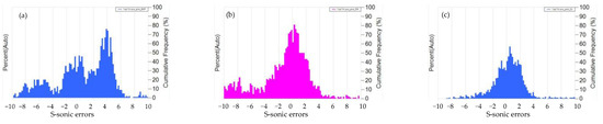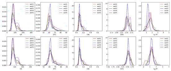 The logging data in the study area were collected in different years. The logging histogram of the marker layer showed that the data distribution characteristics of different wells were inconsistent, especially in the DTC curve. Thus, before training the model, the histogram shifting method was used for multi-well standardization [72]. It can be seen from Figure 9 that after correction, the distribution shape of the same curve in different wells tends to be consistent.