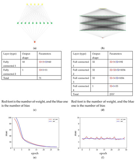 A wide and deep neural network was constructed with five nodes in the input layer whose number is identical to selected feature curves and three hidden layers. The input layer is identical with the number of the selected feature curves; if we added more irrelevant curves, the accuracy and stability of the trained model would be downgraded. The number of neurons in each hidden layer is 32, the output layer has one node, and all layers are fully connected. The activation function of each layer is Elu, the loss function is MAE, and the parameter updating algorithm of the neural network is Adam. The trainable parameters of this network are up to 2337 (the optimization of the parameters for network construction will be discussed later). To compare the result, a shallow network was constructed in the same way, with only one hidden layer, 10 neurons in this layer and 71 trainable parameters. Comparing the training and test error curves of these two networks, the training and testing errors of the deep network are smaller than those of the shallow network, and the error curves are more stable (Figure 11).