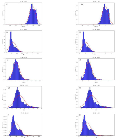 Comparison of statistical characteristics of feature curves before and after normalization. The sub-figures on the left side shows the logs before normalization (a) Density, (c) CNL, (e) log(RT), (g) DTC, (i) GR. Whereas, the subfigures on the right side shows logs after normalization (b) Density, (d) CNL, (f) log(RT), (h) DTC, (j) GR.