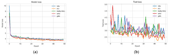 The activation functions mainly include ReLU [77], Leaky-Relu [78], Selu [79], Gelu [80] and Elu [81]; their function, forms and effects are shown in Table 2 and Figure 14. In this paper, the activation function was optimized mainly based on the overall performance of the model in the training set and test set. Figure 15 shows that the ELU function performs best; the error curves in the training and test sets were smaller and more stable during each training epoch.