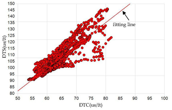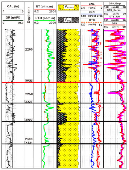 Shear velocity is an important parameter in fluid replacement, pre-stack forward modeling and inversion [1,2,3]. During the seismic forward modeling, the accuracy of shear velocity will directly affect the results of subsequent pore and fluid replacement, affecting the mechanism between the elastic parameters and seismic response at different porosity and fluid saturation states [4]. In the pre-stack seismic inversion, due to the lack of low-frequency information in seismic data, the low-frequency shear velocity model often needs to be obtained by interpolation and extrapolation from wells [5]. In addition, the low-frequency model often controls the whole sedimentary background of the study area [6]. Therefore, the accuracy of the shear velocity log will also affect the final results of the pre-stack inversion. In unconventional reservoirs such as shale gas and tight gas reservoirs, the reservoir parameters can be calculated only with known shear velocity [7,8,9]. Therefore, shear velocity plays a significant role in predicting and evaluating conventional and unconventional reservoir parameters [9,10]. In this case study, the P-impedance overlaps between the gas reservoir and shale, but Vp/Vs can differentiate them better. Only five wells have the shear velocity log in the whole project; thus, the accuracy of calculation of Vp/Vs in other wells is very important for reservoir characterization.