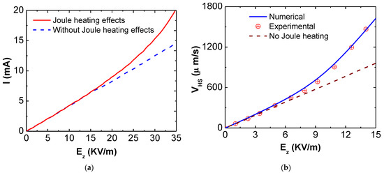 The Joule heating in the microcapillary amplified is at a high electric field [125]. Figure 1a shows that at 15 kV/m, 50% electroosmotic velocity increases in the existence of Joule heating compared to without Joule heating. The electric current increases the fluid temperature for the Joule heating, as shown in Figure 1b. The results show that the 66.5% current is increased in Joule heating compared to without Joule heating.