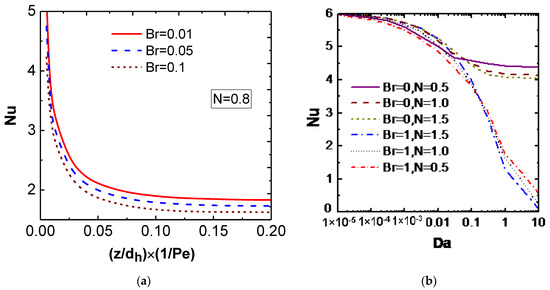 Average Nusselt number as a function of Br and N. (a) Nu vs. (z/dh) (1/Pe) [153] (b) Nu vs. Da [139].