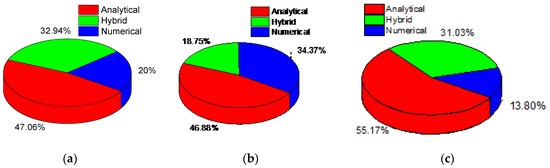 Different analyses employed in percentage to analyze electrokinetic flow in microchannels based on the existing literature. (a) Rectangular channel with electric field applied; (b) Non-rectangular channel with electric field applied; (c) Both electric and magnetic fields applied.