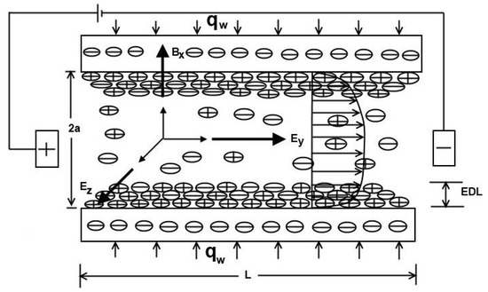 When surfaces of the solid carry a net charge of the polar medium contacting with an aqueous solution, chemical associations or dissociations of ions attract or repel each other. Acids to alkynes pH (potential of hydrogen), clay, sand, the surface of the quartz, ceramics, etc. are examples of the negatively charged surface. The charged surface attracts the oppositely charged counter ions in the fluid, and the surface repels coions. The electrical double layer is formed by excess counterions closer to the interface in the solid-fluid environment. This phenomenon plays an enormous role in colloid science, polymer science, biophysics, medicine, and separation technologies, such as wastewater filtration, membrane filtration, protein, cell separation, etc., are examples of the application and importance of the electrical double layer [68,69]. The EDL develops two layers: the sterned layer (Helmholtz layer) and the diffused layer (Gouy-Chapman). The sterned layer is thin and stationery, which absorbs the opposite ions of the surface. However, the diffused layer is mobile and free to migrate from its surface; a plane forms between the sterned and diffused layers called a shear plane. When the electric field applies tangentially along the surface, the ions move due to an exerting force in the diffused electric layer. Fluid flows through the diffused layer, causing ion drag of the fluid in channels, and the motion of this type of flow is known as electroosmotic flow (EOF) [70,71,72]. Neale [73] stated one important electrokinetic phenomenon in the absence of the electric field where the mobile ions force the fluid to flow by applying an external pressure difference. So, EDL’s mobile charge ions (counterions) move downstream and generate electrical currents in the pressure-driven flow direction. Wall [74] studied the brief history of electrokinetic flow, where the fluid movement is tangential from the charged surface. Lopez-García et al. [75] analyzed the Poisson–Boltzmann equation in electrical double layers consisting of a finite ion size in the aqueous electrolyte solution with the suspension of polarizable insulating spheres in fluids.