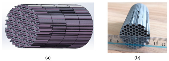 An HTGR that met the requirements in small temperature difference and low flow resistance is designed based on additive manufacturing technology [9,10,11,12,13,14,15,16,17,18,19,20,21,22,23,24], whose geometric model is shown in Figure 1.