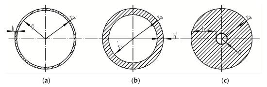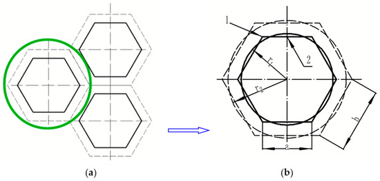 Assuming that the inner side length of the regular hexagonal tube is a, the outer length is b, the inner diameter of the circular tube is r1, and the outer diameter is r2, then the geometry of the equivalent transformation between the regular hexagonal tube and the circular tube is essentially the geometric space transformation between the inner and outer lengths of the hexagonal tube (a, b) and the inner and outer radius of the circular tube (r1, r2). Since the main function of a regenerator is to store and release heat by means of frequent heat transfer between the wall surface and thickness, the equivalent conditions should be: (1) heat transfer areas are equal to ensure the same heat transfer; (2) the volume–specific surface areas are equal to ensure the same heat storage.