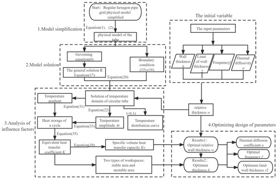 The logical flow chart discussed in this paper based on theoretical analysis is shown in Figure 4. Based on the simplified model of a single–grid regenerator under the condition of unsteady heat conduction, the equivalent transformation condition of the hexagonal tube and the circular tube is obtained. The distribution of the temperature field in the tube is obtained through theoretical derivation, which laid a foundation for the research of this paper. According to the temperature distribution, the heat storage within a period is obtained, and the EHTC K is determined. The relative thickness w is calculated by the dimensionless analysis. The EHTC K is transformed, and SVHTC Kv is obtained. Taking the maximum SVHTC as the objective function and the oscillation frequency f, the grid geometry (r1, r2) and the material thermal diffusivity α as variables, how to obtain the optimal working and structural parameters of the grid HTGR is analyzed. Finally, the general law in the heat transfer performance of HTGR is summarized on the basis of the above discussion.