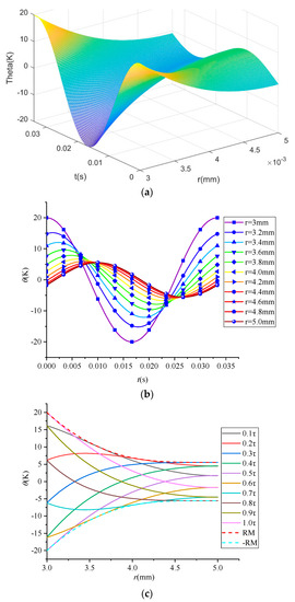 Figure 5 shows the amplitude variation curve with time and radius. Figure 5a is a three–dimensional amplitude–time–radius (θ–t–r) panorama of a period. As can be seen from the figure, the curve varies with time and radius in periodic cosine. The amplitude–radius (θ–r) curve and amplitude–time (θ–t) curve are plotted, as shown in Figure 5b and Figure 5c, respectively. Figure 5b shows the amplitude variation with time at different tube thicknesses. It can be seen from the figure that with the increase in the thickness, the amplitude gradually decreases and the phase angle gradually shifts backward. Figure 5c shows the temperature distribution curve within a period τ at different moments. The dotted lines are the envelope line. The figure indicates that the amplitude decreased with the increase in wall thickness.