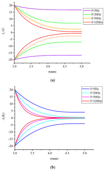 The expression of Ar, the temperature distribution amplitude of the regenerator, was obtained according to Equation (22). The change in the temperature distribution amplitude was affected by frequency, as shown in Figure 7. The amplitude distribution curve reflects the heat storage capacity of the regenerator at different frequencies. The smaller the frequency, the stronger the heat storage capacity of the regenerator, and the larger the heat exchange capacity of each cycle, which is also proved by the subsequent calculation of the periodic heat transfer Qen (Equation (34)). The results also indicate that the temperature distribution became increasingly less uniform with the increase in frequency under the condition of the same tube wall thickness. In terms of circular tubes made from carbon fiber, the temperature at the near–adiabatic part tended to be constant at a frequency of more than 50 Hz, suggesting that no heat exchange occurred at the near–adiabatic part and that such part no longer contributed to heat transfer.