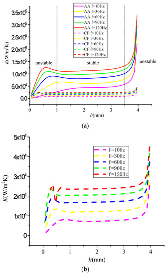where S is the heat transfer area of a single circular tube, which is directly related to the wall thickness h and length l. The total heat exchange time of the Qen is the period τ, and the temperature difference ∆T = 2A. Therefore, the EHTC K of the circular tube regenerator could be calculated by temperature gradient Equation (31) and heat Equation (34).