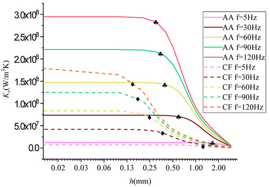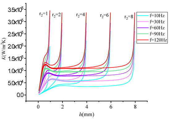 The change in the EHTC K with wall thickness h at different frequencies is shown in Figure 10. According to the structural characteristics of the hexagonal grid tube, the outer diameter r2 of the equivalent circular tube is assumed to be the ultimate wall thickness. In other words, the wall thickness h changes based on constant r2, and could be changed by changing r2.