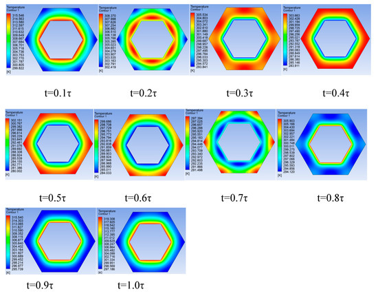 The model of a regular hexagonal tube was established in the same way, according to the equivalent relation with the circular tube; the regular hexagon tube edge a = 3.14 mm and b = 5.24 mm. The temperature cloud diagram of the regular hexagonal tube at a time τ was obtained, as shown in Figure 16. The process of heat absorption and emission through the regular hexagonal tube wall in a period τ can be clearly seen through the cloud image.