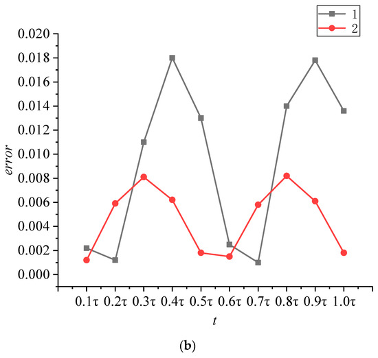 The numerical solution of the regular hexagon tube was compared with that of the circular tube. The result is shown in Figure 17a, where 1 and 2 are the two endpoints of the regular hexagon (Figure 2b); the dashed line stands for the numerical solution of the circular tube. The error between the end points 1 and 2 of the regular hexagonal tube and the circular tube is shown in Figure 17b.
