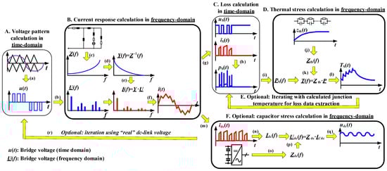 The operation mechanism of ScanTool is as follows. First, excitation waveforms like PWM voltage u(t) are numerically calculated in the time domain as normal. Next, as a highlight of the tool, the response waveforms are calculated in the frequency domain: the PWM voltages are transformed into the spectra U(f) in the frequency domain as excitation signals, while the plant (e.g., the electric motor here) are expressed as/transformed into admittance matrix Y(f) in the frequency domain. Then, by multiplying the excitation U(f) and the plant admittance Y(f), the frequency-domain response spectra I(f) (i.e., current spectra here) can be obtained. The response spectra are then reversely transformed into the time domain to obtain the response waveform i(t) (i.e., phase currents here). After that, the voltage waveform us(t) and current waveform is(t) of each switch can be separately divided in the time domain, and the total loss ps(t) in each switching state can be calculated. By transforming the total loss ps(t) of each switch into the spectra Ps(f) in the frequency domain, the thermal response can be calculated as T(f), and finally get the thermal response Ts(t) in the time domain. Using this method, output waveforms can achieve high steady-state precision, as it has already considered the response harmonics/ripples caused by the load impedance/admittance. Meanwhile, this approach can avoid considerable computation time of traditional time-based simulation tools before reaching steady states. The computing time can be reduced from dozens of minutes to 1–2 s per case. Hence, ScanTool is especially attractive for early-stage conceptual design of power electronics systems, while many cases with different software and hardware combinations need to be simulated. The mechanism of ScanTool is illustrated in Figure 1. For more details, please refer to [19].