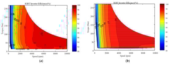 The measured and simulated efficiency maps of the IGBT and SiC inverter are shown in Figure 3 and Figure 4, respectively. Moreover, the maximum and minimum efficiency, and the percentage high-efficiency area (>85%, >95%) are summarized in Table 2 and Table 3, respectively.