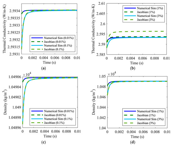 Similar results can be seen for the three main properties of the system: thermal conductivity, density, and specific heat (Figure 3). The results align well, but we can start to see the differences between the linear stability approach and the finite difference simulations as the perturbations increase towards 3%. This is expected as stability models based on eigen solutions are only guaranteed to hold true for small perturbations. For all thermophysical properties with perturbations of 1% or lower, the difference between the new steady-state value the eigen solution reaches and the finite difference model results were 1.30 × 10−2%, or less, at 0.01 s.