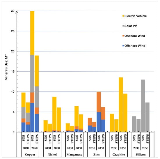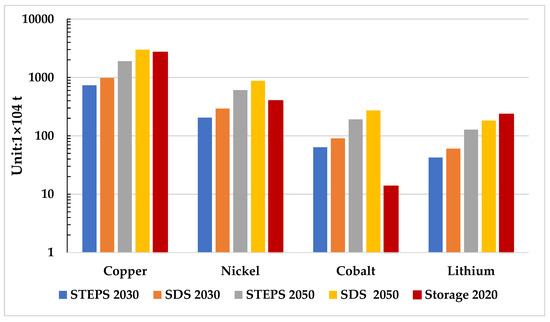 In our assumptions, the electric vehicle stock from 2020 to 2050 is due to a linear extrapolation of the data from 2020 to 2030. We predict that with the developing public transportation network and the decreasing birth rate, the growth rate of electric vehicle stock in 2030–2050 will not vary much from that in 2020–2030; therefore, the multiplier value of the mineral resource consumption of the electric vehicle industry in the SDS compared to the STEPS over the next three decades (2020–2050) is the same as the next decade (2020–2030). However, driven by the energy transition and the general background of reducing carbon emissions, the future of China’s electric vehicle stock will double, and its demand for mineral resources will increase. Compared with the electric vehicle stock in 2020, China’s electric vehicle stock in 2050 will be 32.8 times higher than that in 2020 in the STEPS scenario. The demand for graphite, copper, and nickel mineral resources will reach 9.5, 7.62, and 5.71 MT, respectively, and the total demand for mineral resources in the electric vehicle industry in 2020–2050 will be 32.8 times higher than that of 2020. In SDS, the cumulative mineral resource demand in 2020–2050 will be 46 times that of 2020, and the mineral resource demand for electric vehicles in 2020–2050 will be three times that in 2020–2030. Therefore, the demand for mineral resources in electric vehicle manufacturing will be one of the primary reasons for the future growth of the clean energy mineral demand in China.