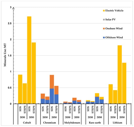 Figure 3 and Figure 4 show the mineral resource requirements of the clean energy sector under different scenarios for 2020–2030 and 2020–2050. Table 9 shows the cumulative installed capacity of clean energy generation technologies and electric vehicle stock in China for 2020, 2030, and 2050. Each clean energy technology is included in two scenarios for 2030 and 2050 under the SDS and STEPS, respectively. From the two figures, different clean energy technologies have different demands on various minerals, and the demand for mineral resources of clean energy technologies varies significantly under varying scenarios.