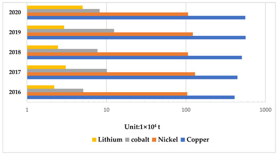 All this time, China has been developing and using existing minerals while also actively exploring new mining sites. From China’s proven resource reserves in 2016–2020 (Table 10), the overall trend of copper, nickel, cobalt, and lithium is stable and slightly increasing. From the current data, China’s overseas imports of mineral resources and the current domestic identified mineral reserves are stable. However, due to mineral resources’ non-renewable characteristics and the urgent need for energy transformation, the gradual depletion of mineral resources is still an irreversible trend.