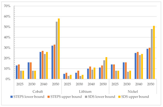 In the face of growing resource supply problems and long-term dependence on overseas imports, mineral recycling has aroused the attention of governments and manufacturers worldwide as a technology that can reduce resource consumption and improve the environment. Recycling is a way to reduce the demand for primary raw materials by generating the so-called secondary materials flows [17]. The development of clean energy technologies in China is still in its infancy, and China started to build clean energy generation facilities on a large scale only within the last decade. As a result, research and technology for mineral recycling in the power sector are quite limited. It is worth noting that China is currently the only market with significant power battery recycling infrastructure [38]. The average lifespan for light-duty vehicles is 15 years, whereas the average lifespan used for medium- and heavy-duty vehicles is 10 years [39,40]. The supply of recycled materials only represents a small portion of total battery material demand in the short term, but has the potential to represent over 50% of future cobalt [41]. As a major automobile manufacturing country, China has been committed to the development of electric vehicles. The future in power battery recycling standards will also be at a high world level. Retired power batteries usually have a residual capacity of more than 70% of the initial capacity and a set lifetime [42]. Referring to the recycling content of the United States under two scenarios, the recycled content of power batteries in China from 2020 to 2050 is shown in Figure 7. A lower future mineral demand for the SDS will result in a higher recycling content than in the STEPS. In 2050, the recycling content for cobalt will be increased to 55%−58% and for nickel increased to 48−51%, which means about half of the materials used in power battery production will come from secondary materials. However, due to the current industry recovery analysis, the power battery recovery industry is not optimistic [42]. Globally, the recycling rates of lithium are close to zero due to its abundancy and low cost. Although lithium is highly recyclable, there is currently no economic driver for this. As of now, the government and manufacturers are not paying full attention to this emerging technology. Information barriers between government, manufacturers, and consumers regarding recycling technology and willingness to recycle are also affecting the implementation of recycling technology [42]. In the longer term, it is expected that recycling will become the major source of mineral supplies, assuring supply stability and preventing price fluctuations due to geopolitical or other factors, which will affect the supply of clean energy technology facilities [17].