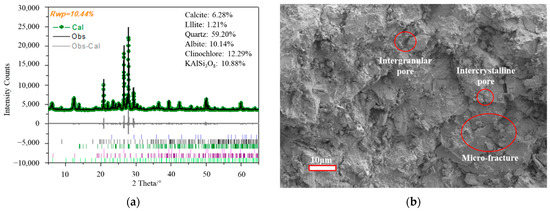 A gray sandstone block taken from a coal mine in the Ordos Basin was used in this study. Some 50 mm diameter cylindrical samples were drilled from the sandstone block in the same direction by a core-drilling machine. Then, the cylindrical samples were cut to about 50 mm in diameter and 100 mm in length by a grinding machine with the high-precision standard proposed by the ISRM. The X-ray diffraction (XRD) results show that the sandstone is mainly composed of quartz (59.2%), clinochlore (12.3%), albite (10.1%), and other minerals (18.4%) (Figure 1a). The pore spaces of sandstone are completely dominated by intergranular pore, intercrystalline pore, and microfracture based on the scanning electron microscope (SEM) results (Figure 1b). Moreover, the average density and porosity of the sandstone are 2.44 g/cm3 and 11.2%, respectively.