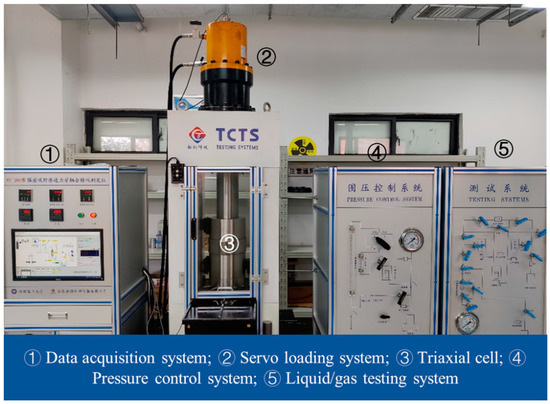 The hydromechanical tests were carried out using a triaxial servo-controlled permeation experimental apparatus. The apparatus, comprising six parts, a servo loading system, a triaxial cell, a pressure control system, a liquid/gas testing system, a data collection system, and an auxiliary system, can supply an axial and confining stress applied to the samples with a stable temperature during the measurement of permeability in this work. The experimental apparatus is shown in Figure 2, and the equipment parameters were described in detail by a previous study [29].