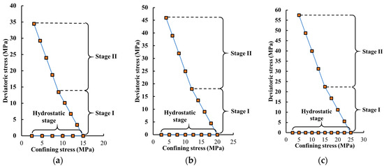 Loading schemes of different sandstone samples ((a–c) are the initial confining pressure of 15 MPa, 20 MPa, and 25 MPa, respectively).