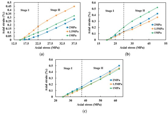Axial strain variation of sandstone under different initial confining pressures ((a–c) are the initial confining pressure of 15 MPa, 20 MPa, and 25 MPa, respectively).