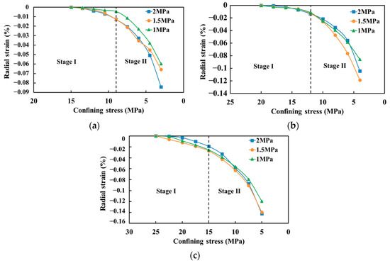 Radial strain variation of sandstone under different initial confining pressures ((a–c) are the initial confining pressure of 15 MPa, 20 MPa, and 25 MPa, respectively).