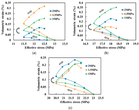 Volumetric strain variation of sandstone under different initial confining pressures ((a–c) are the initial confining pressure of 15 MPa, 20 MPa, and 25 MPa, respectively).