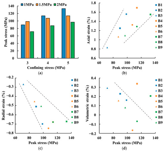 Peak stress and corresponding deformation of sandstone ((a–d) are the peak strength, corresponding axial, radial, and volumetric strain, respectively).