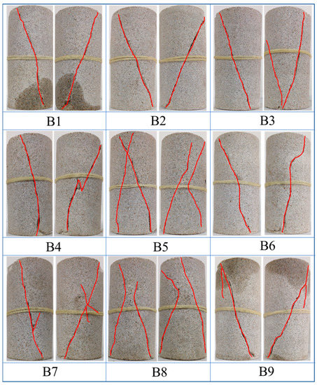 The failure characteristics of the sandstone at Stage III are shown in Figure 8. Overall, after the sandstone undergoes a simulated mining stress loading path, its failure mode at Stage III is mainly a shear failure, because the low confining stress makes the sandstone more brittle, which is manifested as follows: the macroscopic shear fracture pierces through the top and bottom end surfaces of the entire sample, so a part of the samples is in shear–tension failure mode, accompanied by some secondary tensile cracks and shear cracks. Under the same pore pressure, the final fracture morphology of the sandstone tended to be complicated with the increase in initial confining pressure. The overall performance is the transition from shear failure to shear–tension failure, which corresponded to the transformation from a single shear fracture to multiple positive and negative shear fractures, which tend to form an approximate “X”-shaped conjugate shear fracture (samples B5 and B8) or to the main shear fracture followed by a secondary shear–tension fracture (samples B7 and B9). At the same time, the number of fractures developed by the final failure form of the sandstone has a good correspondence with the peak permeability under the same initial confining stress, which represents the greater number of fractures, the better connectivity of the pore–fracture system of the sandstone, the increase in the seepage channel of the fluid, and the improved permeation property, which caused the peak permeability to be larger (samples B3, B5, and B8), indicating that the number of fractures has a significant impact on the permeability of the sandstone.