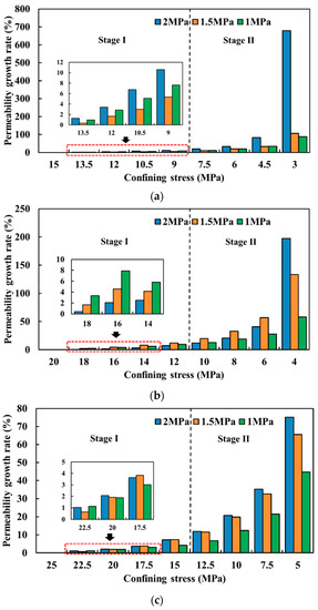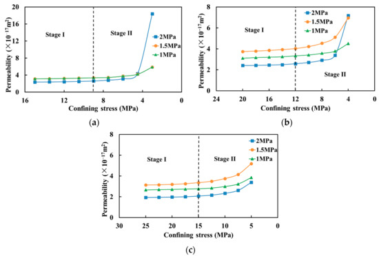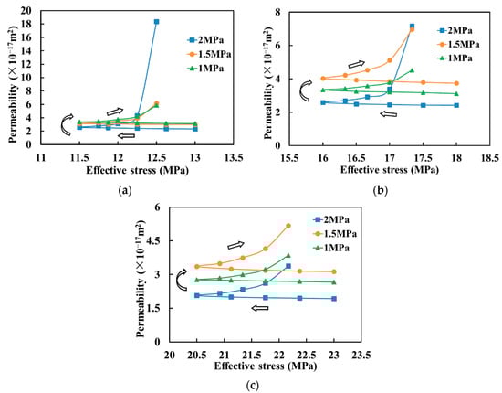 Permeability variation of sandstone under different initial confining pressures ((a–c) are the initial confining pressure of 15 MPa, 20 MPa, and 25 MPa, respectively).